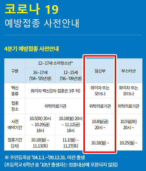 - 임산부 코로나 백신접종 예약 : 10월 8일(금) ~ 11월 12일(금)