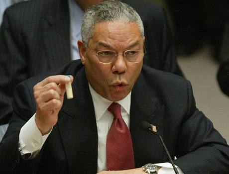 콜린 파월은 국무장관 시절 미국의 이라크 침공을 정당화하기 위해서 이라크가 대량살상무기를 갖고있다고 주장했습니다. 하지만 이후 이 사실이 조작된 것으로 밝혀지면서 정계에서 물러났습니다.