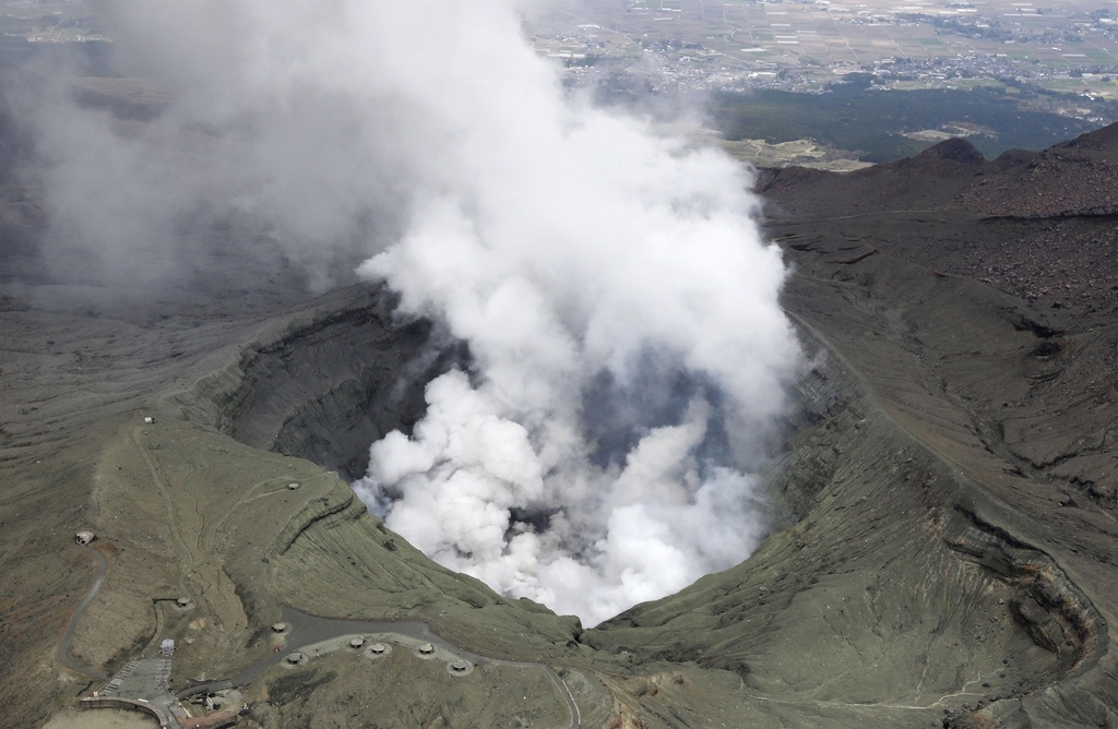 일본 아소산 화산폭발은 칼데라 모양의 화산으로 현재 로프웨이, 온천 등의 관광지로 조성되어 있습니다. 분화구 안에 사람이 살고 있으며 철도와 도로도 나 있고, 산 기슭에는 초원에서 소를 키우기도 합니다.