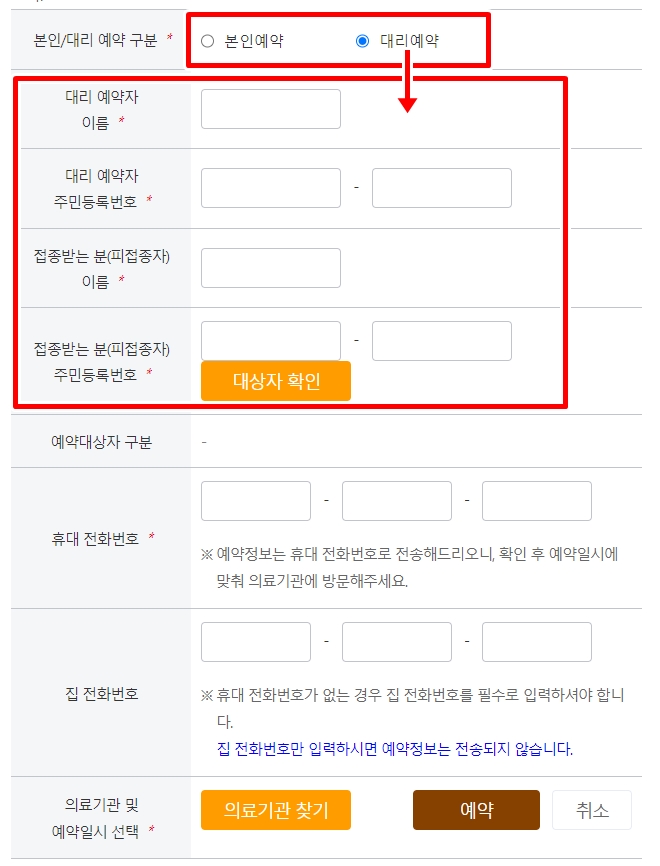 대리예약일 경우에는 대리 예약자의 이름과 주민등록번호, 접종받는 분의 이름과 주민등록번호를 모두 입력해야 합니다.