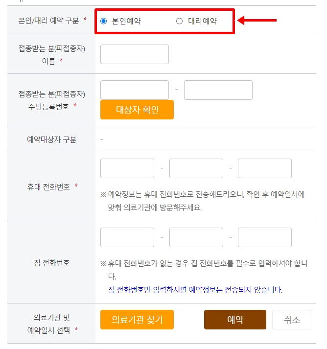 본인예약과 대리예약 중 선택을 합니다.