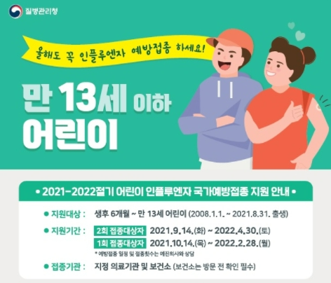 무료접종 대상 : 생후 6개월 ~ 만 13세(2008년 1월 1일 ~ 2021년 8월 31일 출생)