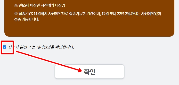 본인 또는 대리인임을 확인합니다. 이후 본인인증을 한 후, 인플루엔자 예방접종 사전안내 예약하기를 선택합니다.