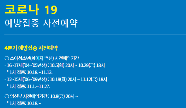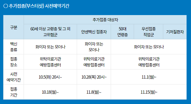 10월 28일 오후 8시부터 예방접종사전예약시스템(하단 링크 첨부)에서 예약이 가능하며, 11월 8일부터 부스터샷 접종이 가능합니다. 또한 50대와 기저질환자, 우선접종 직업군의 경우 11월 1일 오후8시부터 예약이 가능하며, 15일부터 접종이 시작됩니다.