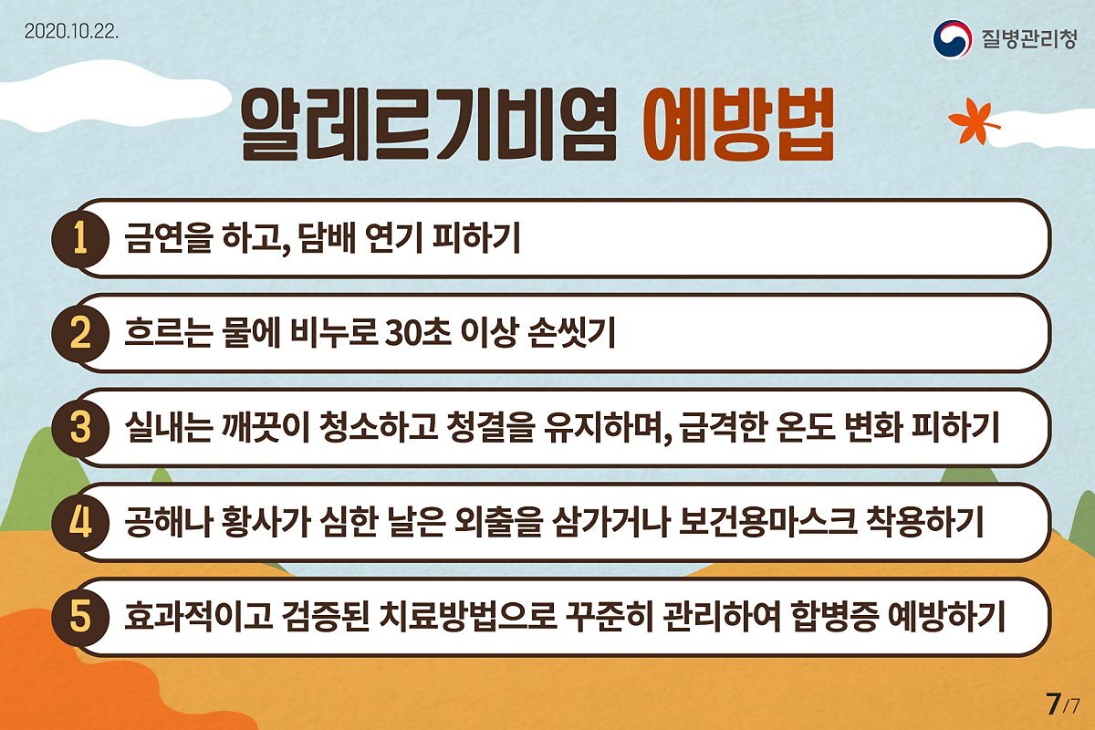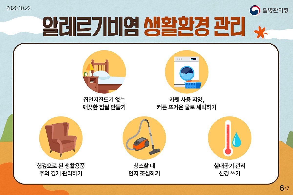 가장 효과적인 치료 방법은 원인을 제거하는 것입니다. 알레르기 항원을 피하기 위해서 주변 환경을 깨끗하게 청소하는 것이 좋습니다. 집먼지 진드기를 예방하기 위해 향균 소재의 침구를 사용하고 자주 세탁합니다.